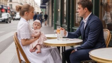 She knelt beside the table on the sidewalk, gently rocking her baby.— Please… I don’t want your money. Just a…