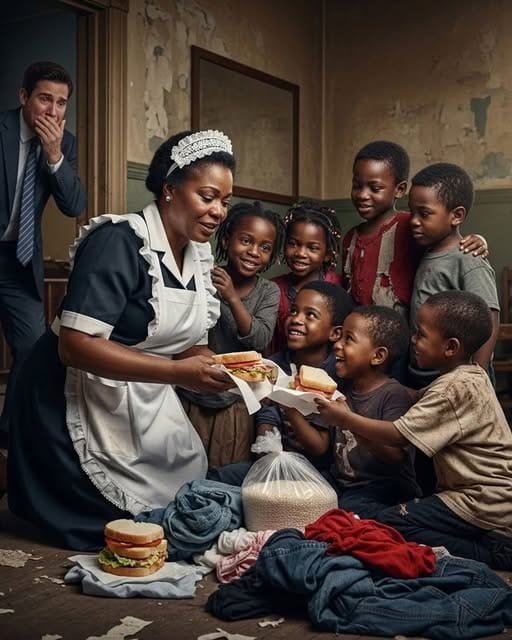 She smiled gently and divided the meal carefully so that everyone received the same amount. Then she took out an old, hand-patched coat from her bag and draped it over the boy’s shoulders.