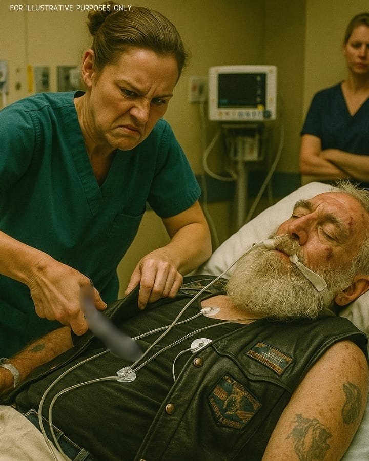 He lay unconscious, his leather vest still on, stained with blood. His silver hair was matted, his tattooed arms visible under the cut fabric of his shirt. Nurses exchanged knowing looks—judging the smell of engine oil, the patches from military tours, the rough exterior.