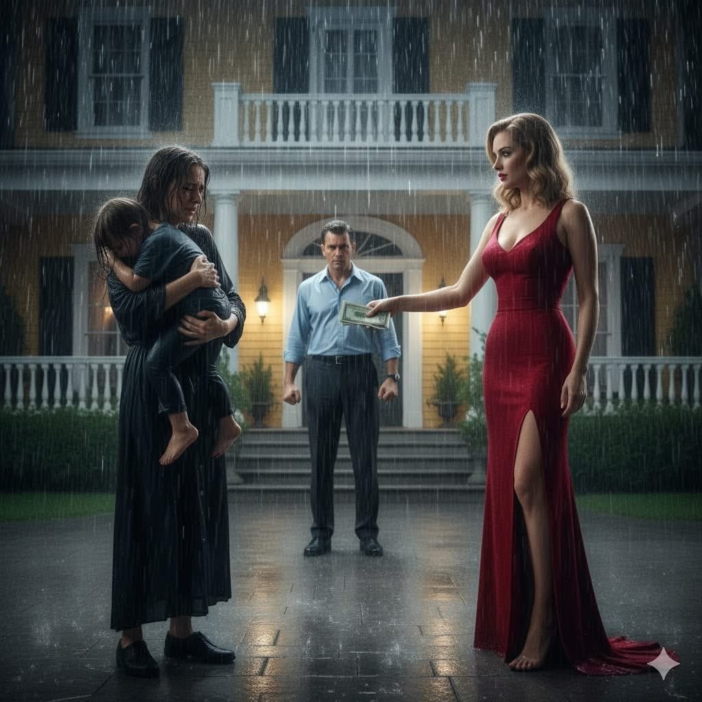 Behind her, sheltered under the porch, stood Daniel, her husband. He leaned casually against the doorframe, one arm wrapped around the waist of a young woman in a red coat. His eyes were distant and cold, as if he were speaking to a stranger.